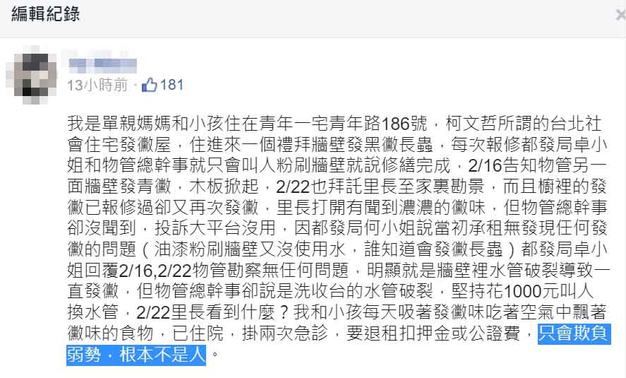 原PO在臉書社團「爆料公社」發文自稱是單親媽媽,「柯文哲所謂的台北社會住宅發黴(霉)屋,住進來一個禮拜牆壁發黑黴長蟲,每次報修都發局卓小姐和物管總幹事就只會叫人粉刷牆壁就說修繕完成」。