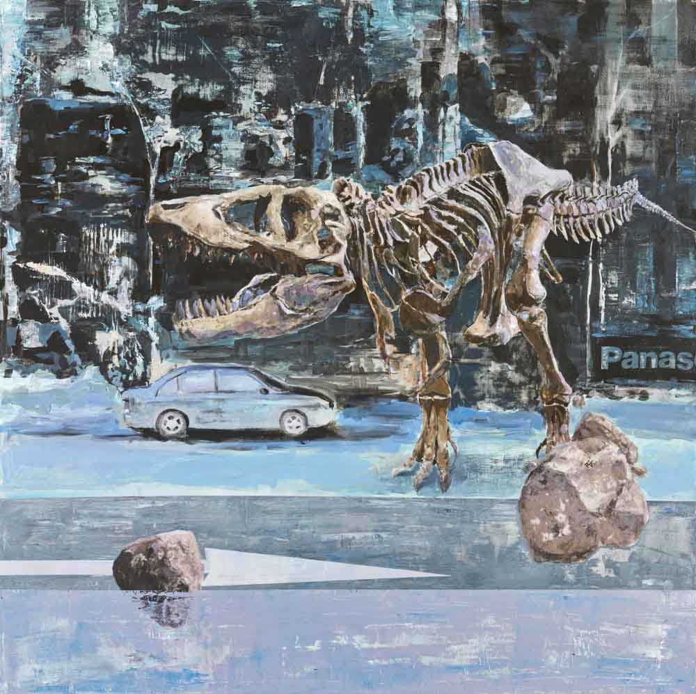 這幅名為「出路」的作品,靈感則是來自電影侏儸紀公園,古代恐龍與現代的汽車出現在同一個畫面,隕石上代表蘇美文明的符號,透過壓克力顏料,表現時間感的濃厚意象。 歡迎喜愛藝術的觀眾朋友,前來感受藝術家筆下,大自然生生不息的力量。