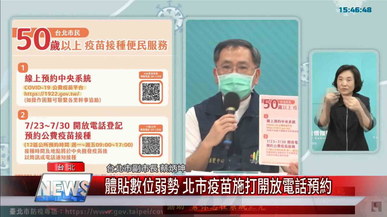 台北市副市長蔡炳坤也說道,自明日起(7/23-7/30),我們將每日提供貼心電話預約疫苗服務, 只需打個電話到區公所,就能協助各位登記。請市民朋友把握時間,爭取施打疫苗。