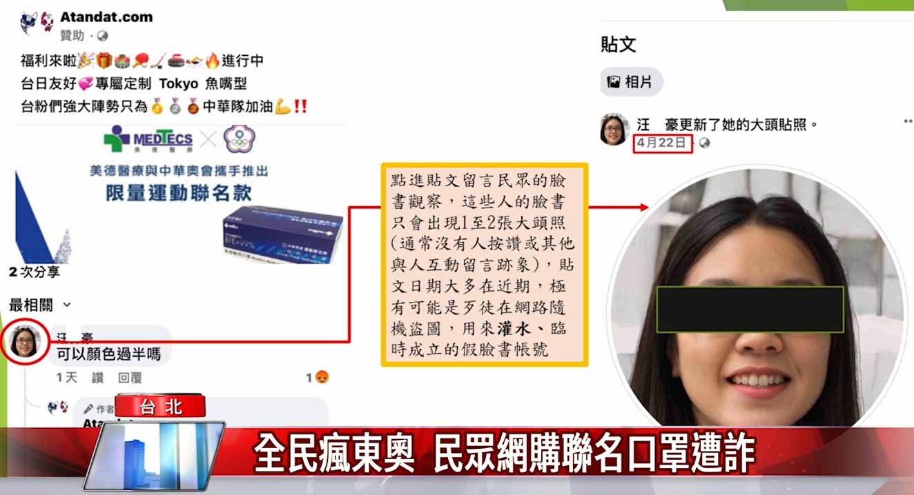 全民瘋東奧,民眾搶買周邊商品,就有一名陳姓男子,在臉書粉絲專頁看到東奧聯名款口罩廣告,留言詢問後卻被賣家以「私訊」引導至網購平台下單,最終卻收到價差至少5倍以上的一般口罩,因而氣憤報警。刑事局預防科偵查員魏愷嫻表示,詐騙集團在粉絲專頁成立臨時粉專、投放一頁式廣告,誘騙民眾點擊連結或留言詢問,再進一步引導至假的購物平臺下單,呼籲民眾小心上當。