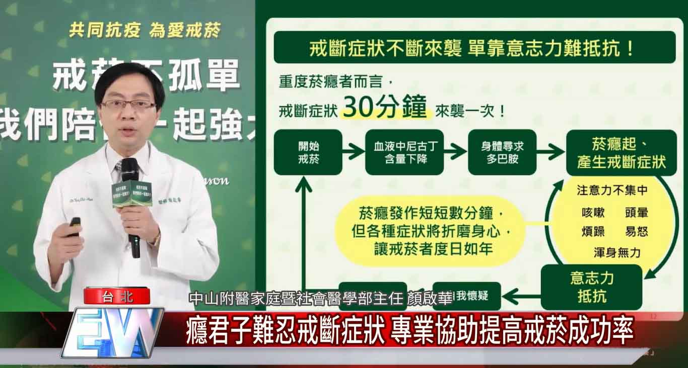 國外研究報告指出,在新冠肺炎疫情期間,吸菸者相較不吸菸者,可能感染新冠肺炎的風險高出2.14倍。在外戴口罩不便抽菸,回家面對老婆小孩家人,二手菸的危害處處存在,不如趁此戒菸。不過戒菸對每個人難易度不同,中山附醫家庭暨社會醫學部主任顏啟華就說到他曾遇過戒菸十幾次仍失敗的案例。