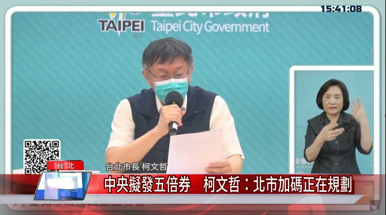 柯文哲說,特定行業的補助尤其餐飲、旅館業是受傷最重的產業,北市正在研究協助產業轉型,至於中央五倍券要怎麼做,北市要配合還是獨立加碼振興等,也都在規劃中。