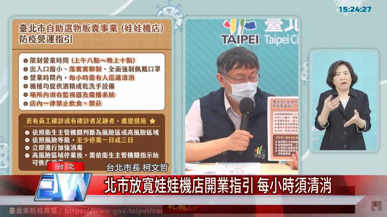 柯文哲表示,以娃娃機店為始,開業時間限制為早上8點至晚上10點, 縮小出入口並全面佩戴口罩。在營業時間內還必須每個小時清消。 機檯必須提供酒精或者乾洗手,也一律禁止在店裡飲食。在疫情持續受到控制下,原則上只要壓制確診數每天都個位數以下,慢慢解封心態上保持小心,在防疫、經濟中間取得平衡。