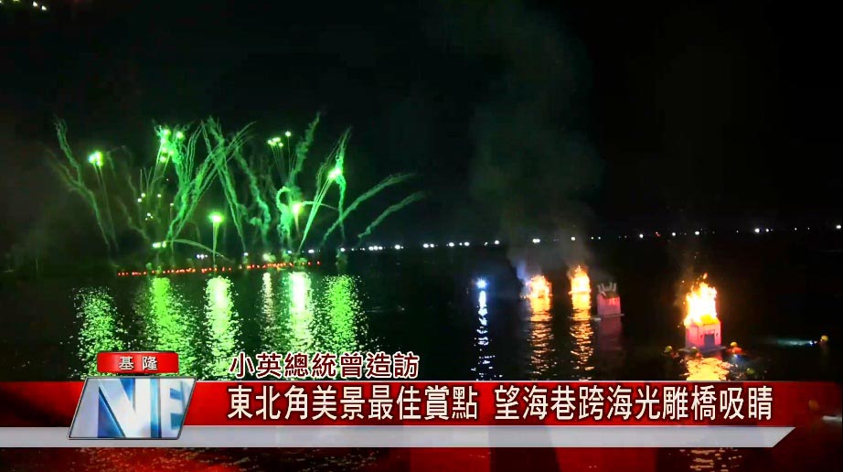日前望海巷施放水燈頭活動中,除了夜空中的煙火及海面上燃燒的各姓氏水燈外,最吸睛的就是這座橫跨漁港上方的光雕橋,這是基隆市政府爭取前瞻基礎建設計畫經費打造的150米長跨海景觀橋,完工後吸引不少民眾搶先體驗,欣賞潮境灣與九份等東北角一帶的無敵山海美景。