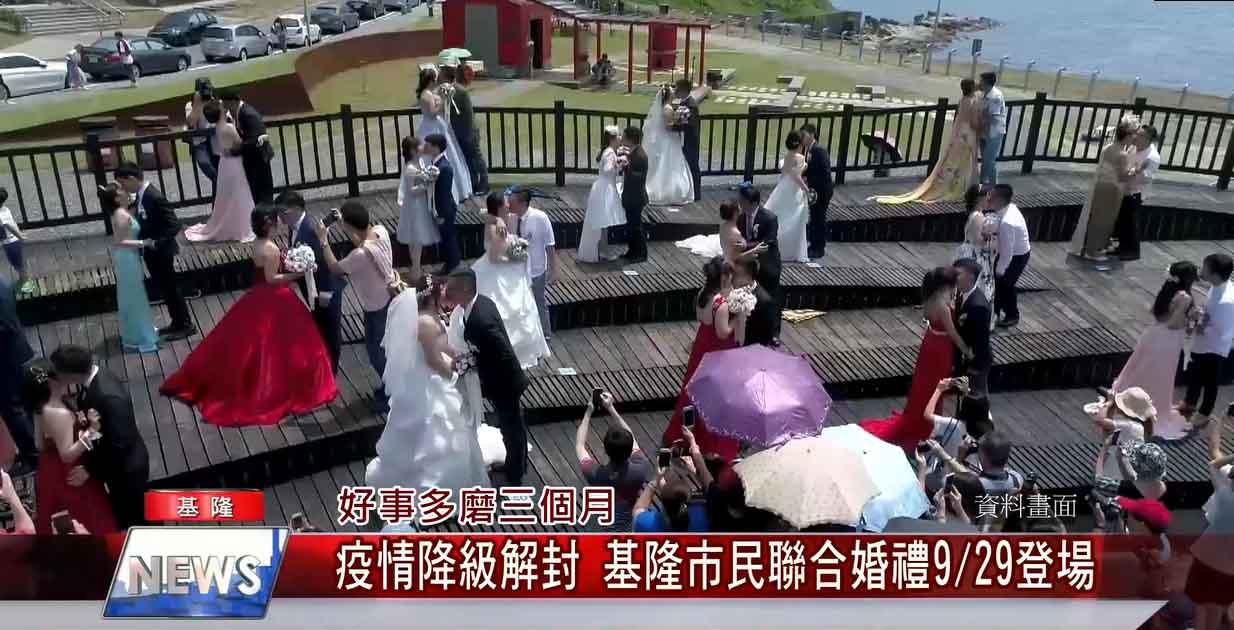 每年的基隆市民聯合婚禮總是吸引許多新人搶著報名參加,基隆市長林右昌今年特別加碼擴大開放到50對,不過原本預定6/22舉行的基隆市民聯合婚禮卻因為國內新冠疫情大爆發而暫緩,讓不少新人及家屬擔心聯合婚禮會不會取消。幸好近期疫情趨緩,不但降級解封還放寬室內及戶外的容留人數,基隆市政府因此宣布延宕三個月的基隆市民聯合婚禮確定在9/29登場。