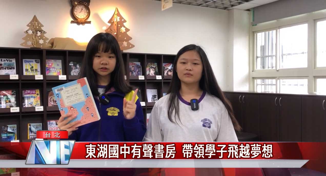 東湖國中107年開始成立校園有聲書房,由表藝社團同學,利用每周四的午休時間錄製影片,介紹書本給同學們欣賞,不管是台灣超馬選手陳彥博挑戰北極馬拉松,還是用寫信環遊世界的小男孩托比,表藝社同學都能在5分鐘的影片中,透過生動的表演引發觀者的閱讀興趣。
