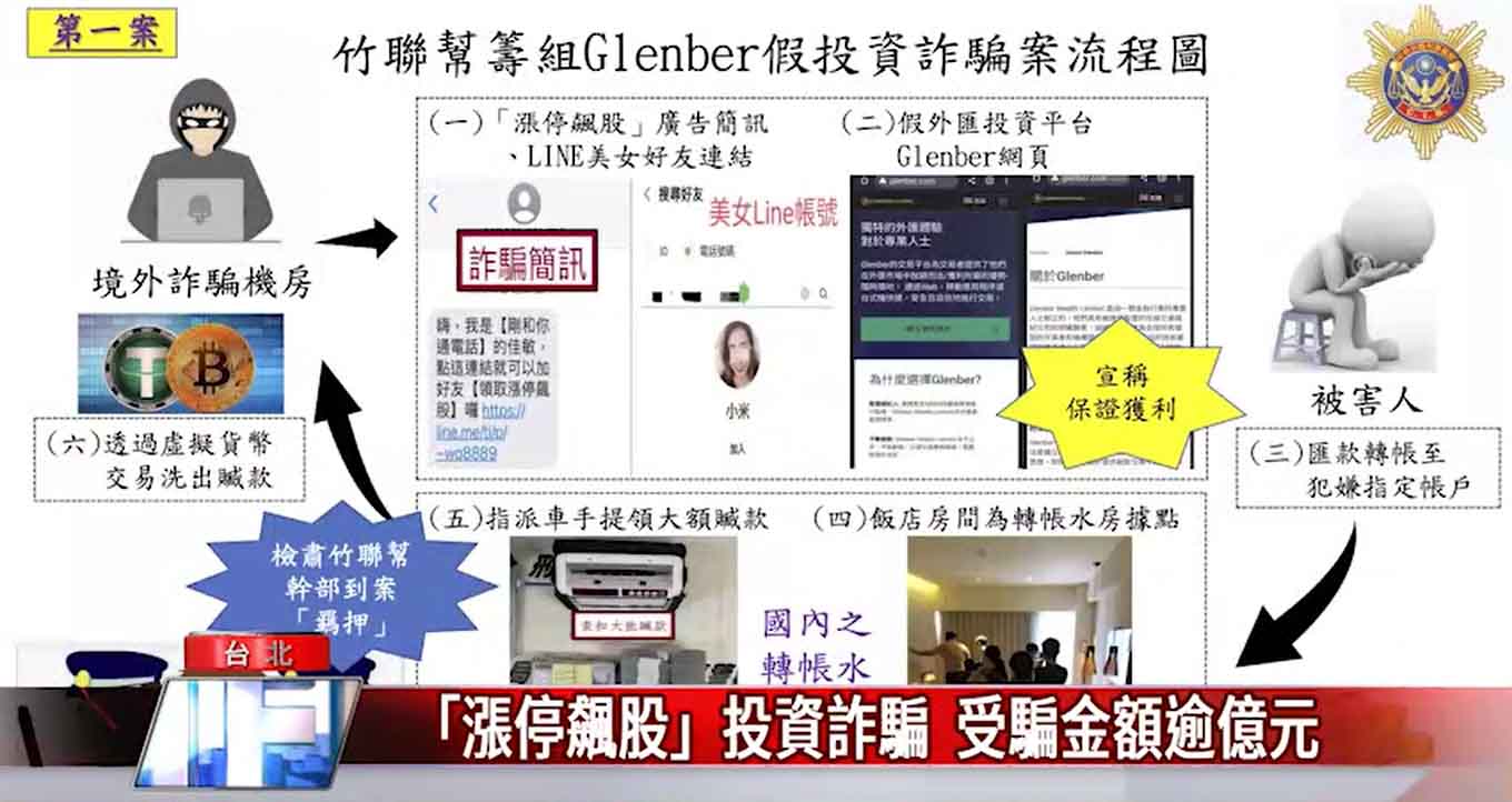 刑事局偵七大隊在這次「全國同步打擊詐欺專案」期間,破獲一宗以陳姓男子為首的投資型詐騙集團。該集團以發送大量廣告簡訊,聲稱有門路投資「漲停飆股」,民眾透過簡訊連結加入通訊軟體好友後,詐騙集團再以美女照片與民眾聊天,取得信任後再誘騙民眾去假外匯平台「Glenber」投資。民眾起先投資嚐到甜頭後加碼,詐騙集團就消失無蹤,該集團以此手法行騙,短短數月以來騙走超過1億元。