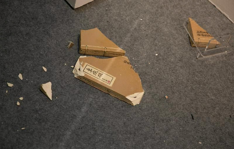 方文山與索卡藝術跨界合作,推出方文山X周杰倫《龐克貓史汀》聯名款限量潮流公仔,也以名曲《東風破》、《煙花意冷》創作窯燒作品。沒想到隔幾天這本「東風破」卻破了,咖啡色書籍藝術品掉落在地,成了大小不等的碎片。地上清楚的看見東風破的書名及連同擺放的架子。