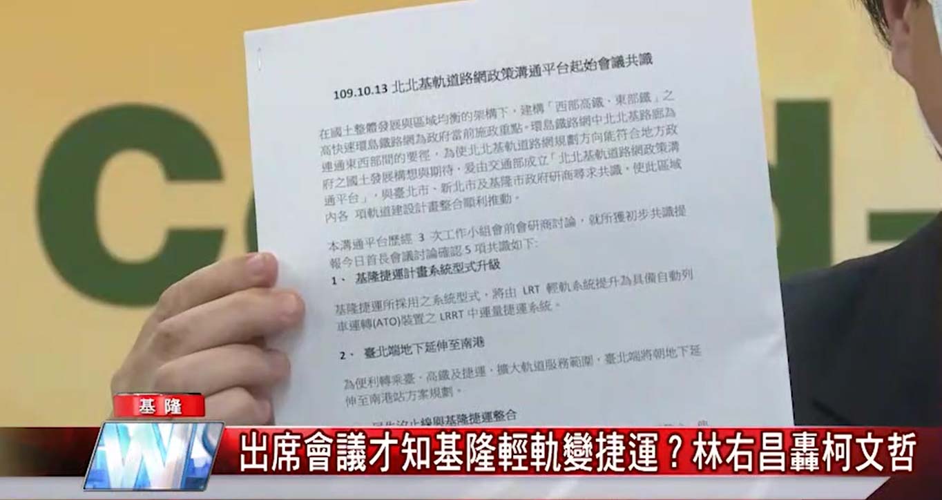 交通部長王國材日前表示「基隆捷運」將於近日確定路線,卻意外引發台北市長柯文哲與基隆市長林右昌隔空互嗆。柯文哲25日再度回嗆,指「基隆輕軌」變「捷運」是「四長會議」才突然冒出的議題,現在路線還沒確定,基隆捷運也沒有到基隆。對此,林右昌氣得召開記者會親上火線說明,他拿出當時「四長會議」共識的文字紀錄表示,會議前一天與會首長都確認過內容,回擊柯文哲說「基隆輕軌升級為捷運,是當天才知道」的言論。他怒轟柯文哲「說謊、沒有政治誠信」,真得有夠離譜。