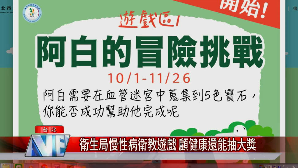 台北市政府衛生局推動慢性病防治系列活動「阿白的冒險挑戰」、「健檢服務登錄與遊戲」、「影片有獎徵答」,操作遊戲的你,化身成主角阿白的夥伴,透過線上闖關答題的方式蒐集到5色健康寶石,闖關成功即有機會獲得健身環、藍芽耳機、電子禮券等好禮。台北市衛生局推動慢性病防治健康識能,透過三個遊戲,民眾回答挑戰題目,就有資格參加總價值超過20萬元的抽獎活動。