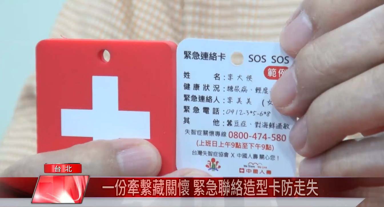 內政部警政署統計,去年全台有4500多名失蹤長者近5成有失智情況,台灣失智症協會推出新型預防走失輔具「緊急連絡卡」,類似吊飾設計可增加失智者配戴意願。 這個可愛又小巧的造型吊飾,裡面放著緊急聯絡人小卡,方便配戴者發生意外時讓旁人可以快速聯絡親人,這是台灣失智症協會與人壽業者推出的防走失輔具,希望藉此減少失智症走失案件,也可以縮短失蹤親人等待音訊的時間。