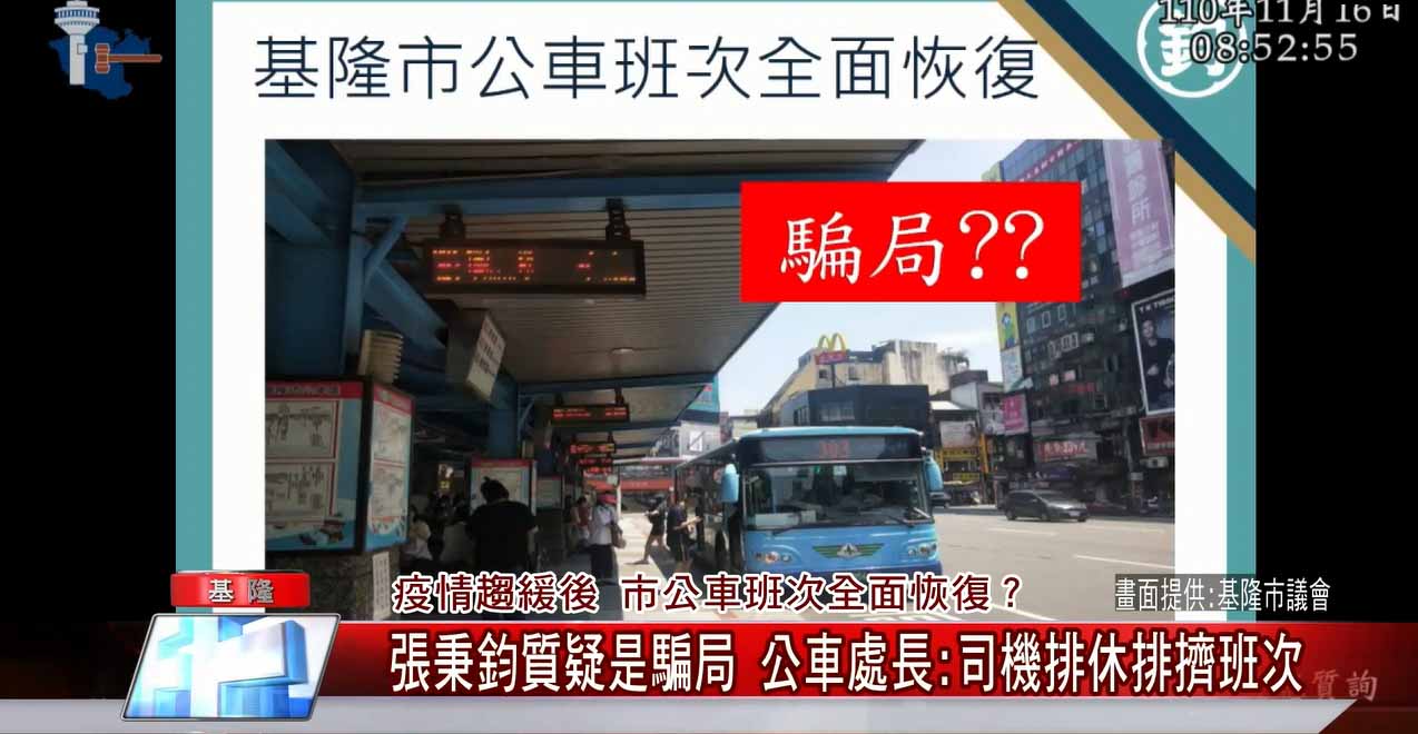 基隆捷運問題吵了十幾二十年還沒有結果,基隆市公車和國道客運的班次多寡對市民來說,反而是最實際最重要的事,基隆市議員張秉鈞就質疑,疫情趨緩之後公車處表示全市公車班次已經全面恢復的說法是一場騙局,因為有太多民眾反應公車班次明顯減少,不只是中山區應該是全市性的問題。