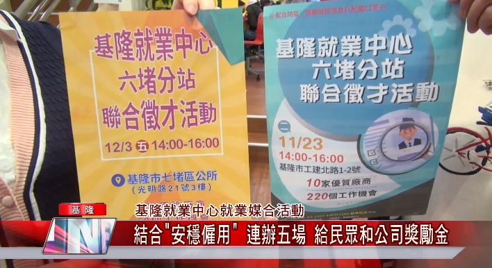為了鼓勵並且協助求職民眾在疫情趨緩後積極走出來找工作,同時也鼓勵公司企業釋出職缺積極求才,勞動部基隆就業中心從11月23日開始到今年年底之前,分別在基隆就業中心以及六堵分站和七堵區公所,連辦五場求職徵才媒合活動。