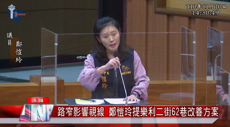 基隆市議會定期大會市長施政總質詢議程,市議員鄭愷玲質詢時關心壯觀里高地用水工程。鄭愷玲議員表示,該工程已於十月開工,她建議透過這次的改變,能重新檢討「壯觀里唯一對外的合法道路」樂利二街六十二巷三民里段。因為受高牆的阻礙及不適用的人行步道,造成道路路寬不足及視線受限,以至於影響壯觀里民人車出入的安全。