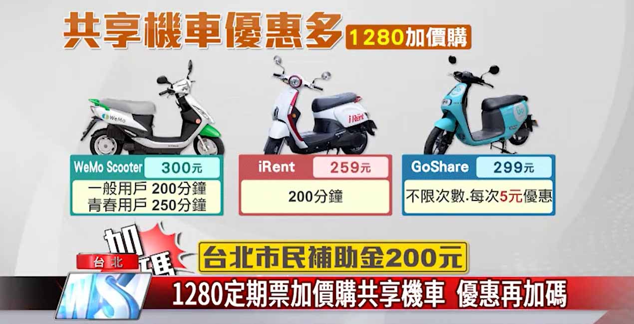 為響應大眾運輸為主、共享機車輔助之理念,台北市三家共享機車業者WeMo Scooter、iRent及GoShare推出期限30日之定期票加價購優惠方案,價格各為300、259及299元,民眾只要持有效期內之1,280元公共運輸定期票都可以加價購共享機車方案,此外,台北市民還額外享有每月一次200元加碼補助,相當於只要再加59元起,除了台北捷運、雙北公車及雙北YouBike優惠之外,還可以享有共享機車的服務,民眾可依需求選擇並購買最適合自己的優惠方案。