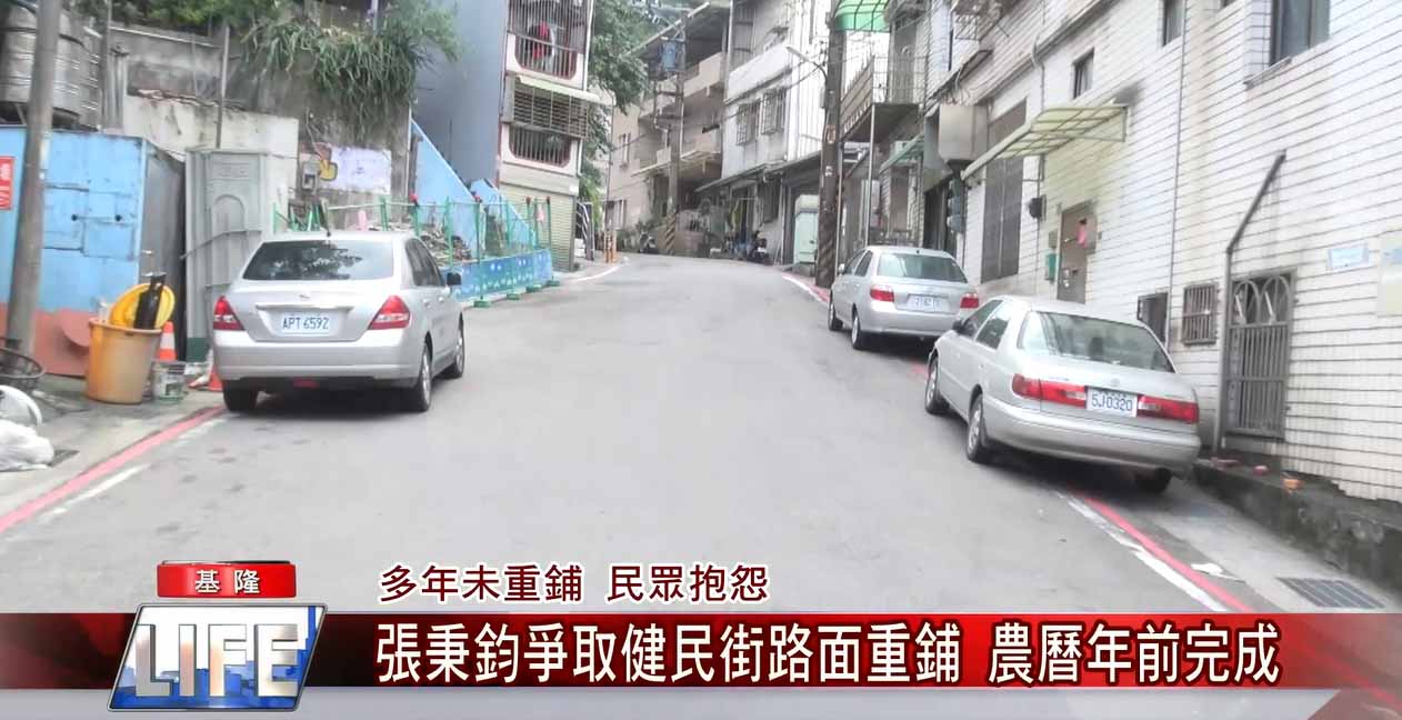 基隆市中山區健民街路面多年沒有重新刨鋪,路面不平龜裂引起民眾抱怨!基隆市議員張秉鈞表示,在當地里長郭正勇反應下,市議員張秉鈞邀請里長以及市政府工務處等相關單位人員現場會勘,爭取在農曆年前重新刨鋪完成,維護用路人的安全!