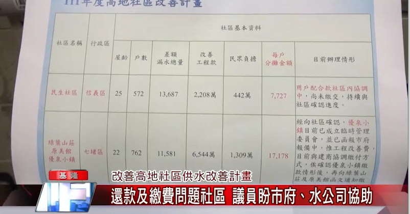 除此之外,民生社區以及七堵區的還款方案和繳費方式經常出現問題,市議員何淑萍表示,希望基隆市政府和水公司一區處能夠協助社區解決這些問題,讓改善工程儘快進行!
