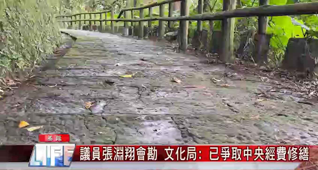 基隆著名古蹟二砂灣砲台登山步道,因為多雨天氣地面長滿青苔,連一旁扶手也腐爛,常有登山客滑倒。基隆市員張淵翔邀請文化局一同前往會勘,縱使腳上穿的是登山鞋走起來也是步步為營。