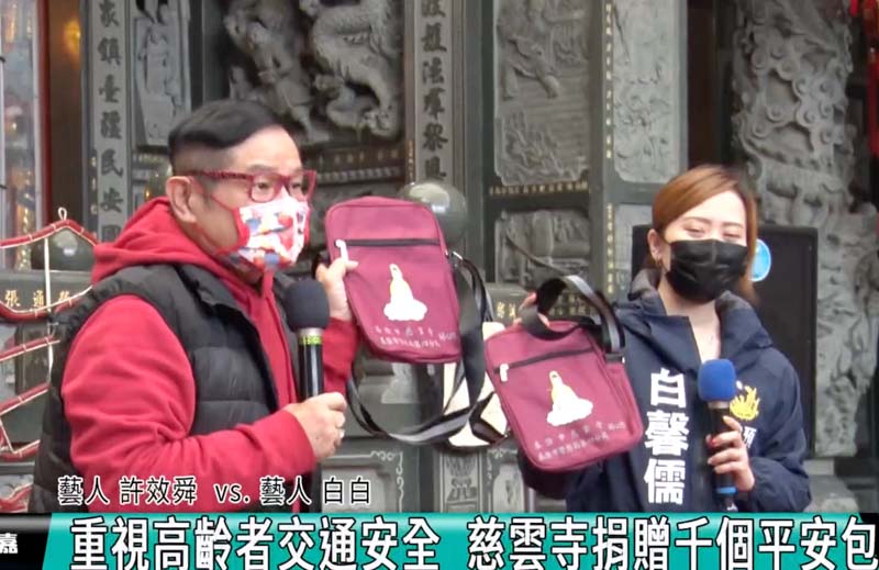 藝人許效舜與白白當宣導大使在臺上說說笑笑宣導交通安全,提醒老人家過馬路時要帶上平安包,並開玩笑地表示,還可以一邊高喊:「佛祖來了!」,逗得台下長輩笑呵呵。許效舜指出,這個平安包與戴在頭上的平安帽,都有神明加持過也都會反光,有助於行路安全。