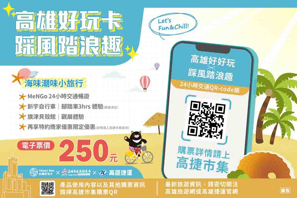 觀光局長高閔琳表示,「2022高雄好玩x踩風踏浪趣」主推旗津的便捷交通、特色場館、餐廳憑卡優惠等,民眾購買套票可免費搭乘旗津渡輪來回一次,走訪最新的熱點鼓山魚市場、高雄燈塔、遠眺高雄大港美景,還可免費參觀旗津貝殼館及租借3小時自行車,自在暢遊旗津大島,最後可停駐在旗津沙灘吧,輕鬆享受百萬級沙灘夕陽美景、微醺晚風與無敵海鮮,愜意到不行;而「2022高雄好玩x鳳雄旺吉」套票,則帶您深度探訪充滿宗教人文氣息之旅,匯集網路打卡熱點的鳳儀書院、黃埔新村、佛陀紀念館、大樹舊鐵橋、三和瓦窯、鳳梨工場等地,利用捷運、公車搭配Ubike輕鬆串連,沿線還有許多優惠商家及古早味美食,絕對是體驗鳳山、大樹區指標景點,絕不可錯過的首選套票。