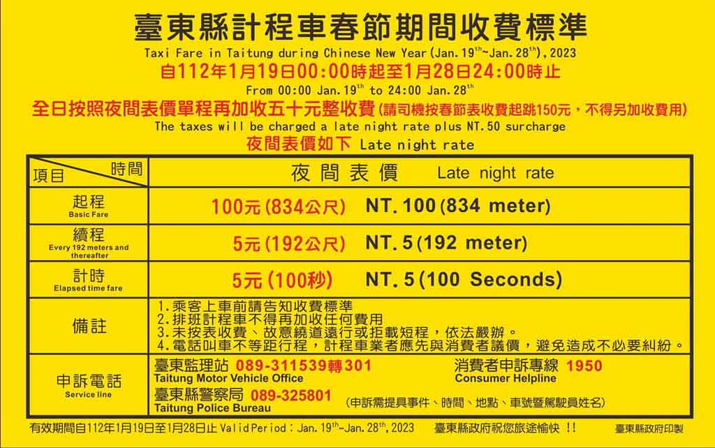 在公共交通部分,台東市區公車普悠瑪客運1/21營業服務至19:00止、1/22於8:00以後開行外,其餘時間皆照常營運;興東客運(原鼎東海線)及東台灣客運(原鼎東山線)春節期間皆照常營運,台東縣計程車春節費率加成實施期間為1/19至1/28日止,收費方式為全日採夜間費率再加收50元,請搭乘旅客多加留意。