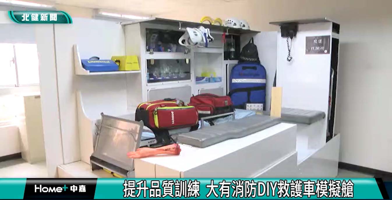 消防隊員為民眾進行身體檢查,並將民眾送上救護車前往醫院,雖然只是模擬訓練,但這個救護車模擬艙可是完全依照真的救護車1:1規格複製打造,整個救護車模擬艙都是桃園市消防局第一大隊大有分隊的隊員自己設計DIY打造,希望讓救護訓練品質可以更穩定。
