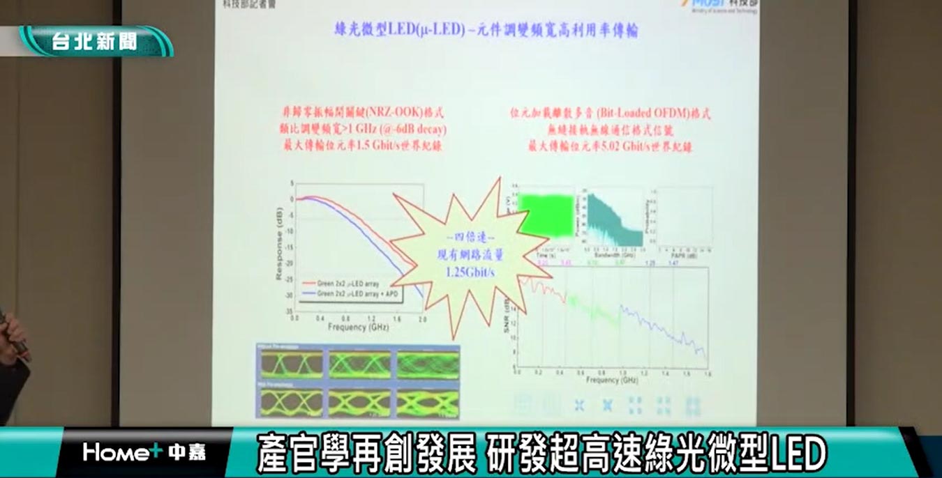 台大和陽明交大等單位合作,開發出超高速綠光微型LED陣列,突破過去可見光的無線通信數據傳輸速度,能讓影像傳送更快、更好,這個研發成果,是繼高速藍光與紅光微型發光二極體元件的開發後,完成讓智慧顯示裝置也能進行自由空間光通訊研究發展的最後一哩路。