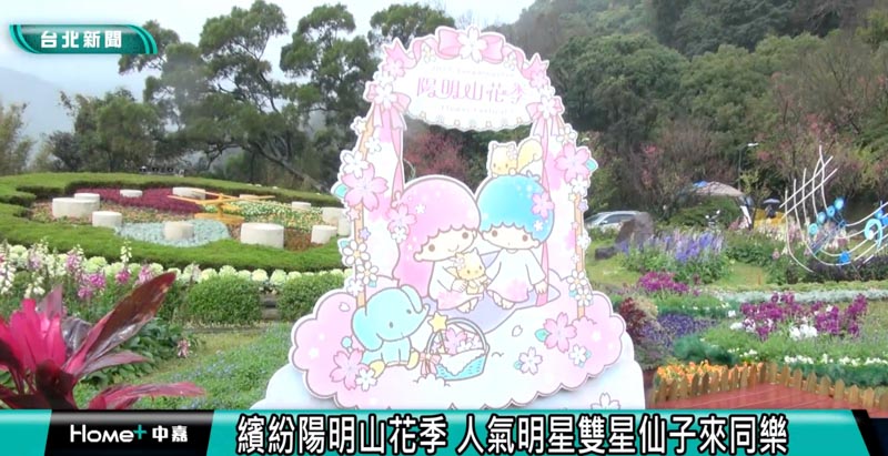 三麗鷗人氣明星雙星仙子打卡裝置,擺放在陽明山花鐘前,呼應著花季繽紛療癒的特色,邀請民眾來賞花同樂。每年陽明山花季是北台灣花展中一大盛事,吸引不少賞花人潮,今年以「花見春櫻」為主題,展期到3月20日。