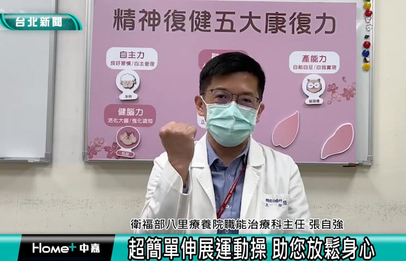 首先,將雙肩膀慢慢向後轉3到5圈放鬆肩頸與背部肌肉,雙臂交叉往後抱到肩胛骨,接著交纏,指尖朝上伸展,感覺上臂和肩頸都有伸展到,這就是衛生福利部八里療養院職能治療科推廣的肩膀及上背肌肉伸展運動,給常常滑手機、辦公維持低頭姿勢的民眾,適時舒緩一下。