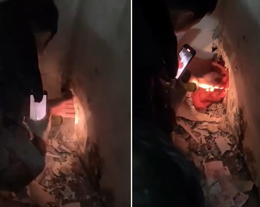 ▲警察把老鼠洞挖開,發現多張鈔票。(圖/微博)