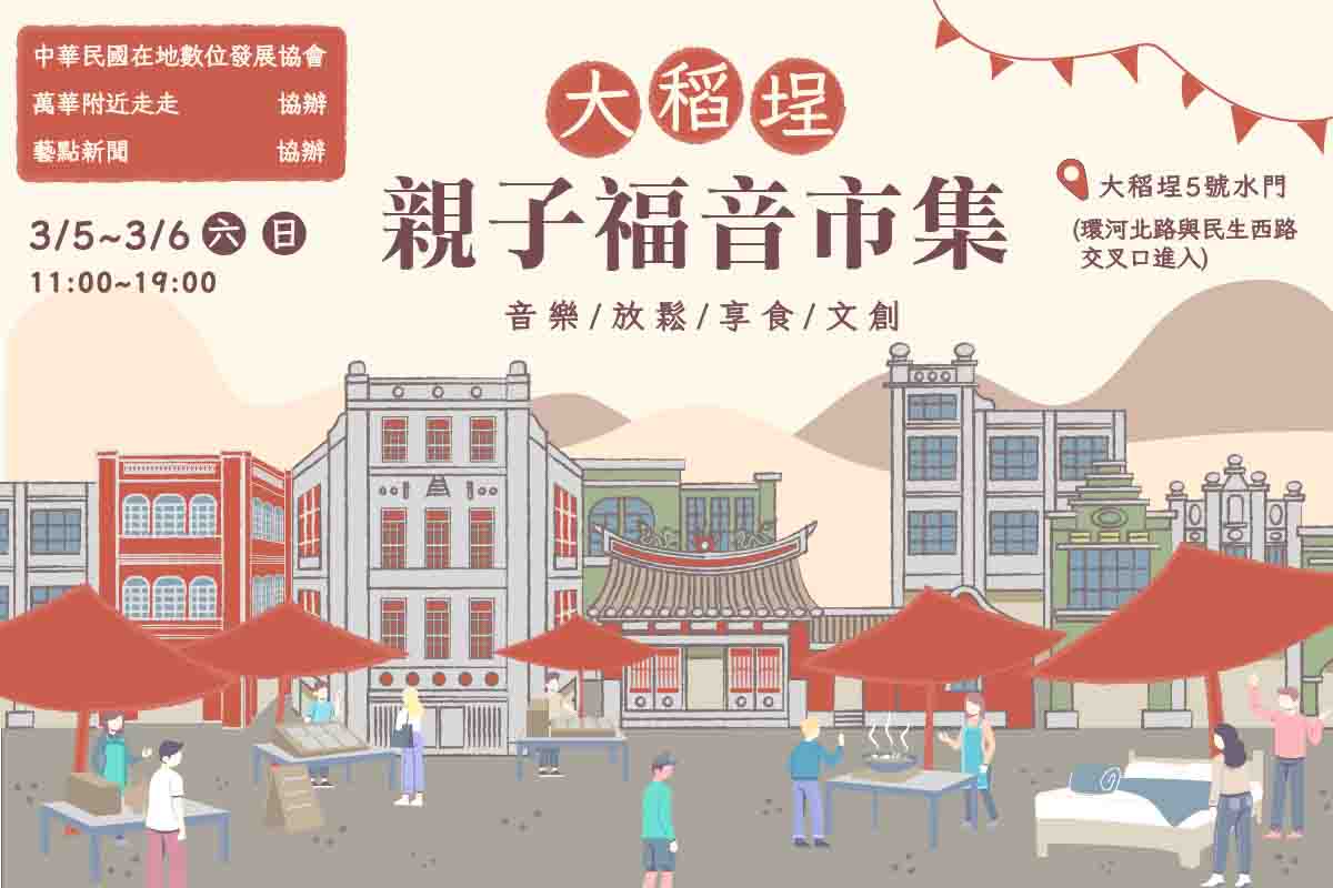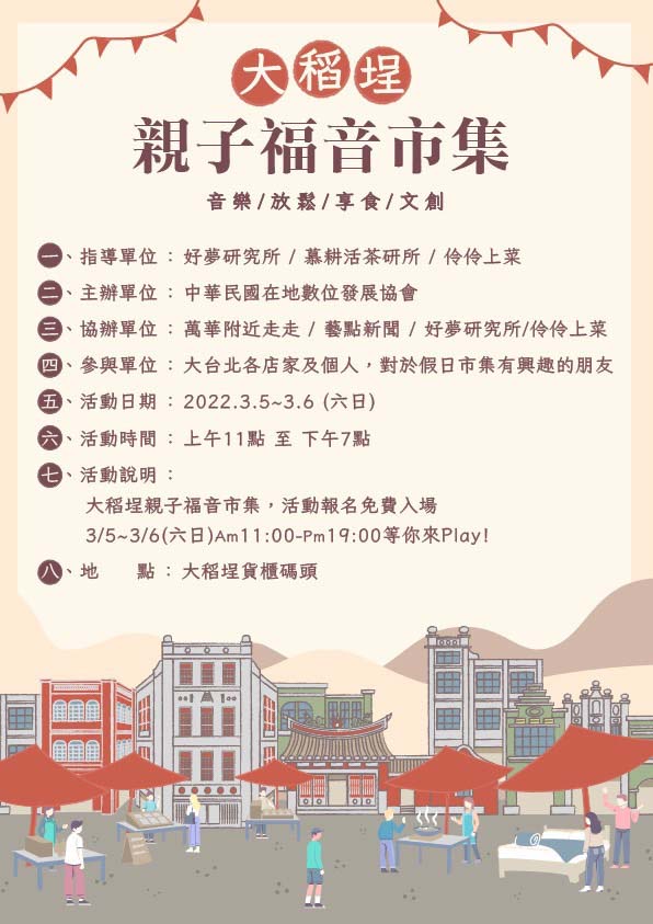 「大稻埕親子福音市集」於本週六、日上午11:00至晚間19:00舉行,由中華民國在地數位會主辦,藝點新聞、萬華附近走走、好夢研究所、伶伶上菜,合作推動市集PT計劃,這次的市集結合許多台北市在地店家,將福音帶入市集,為台灣疫情禱告。