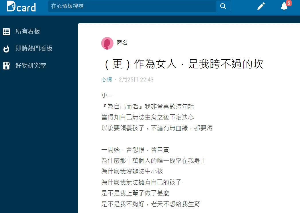 原PO在Dcrad「心情板」發文表示,國三那年,因為一直沒有來月經,被媽媽帶到婦產科檢查,「當冰冷的儀器在我肚皮上滑過時,彷彿聽到了宣判,『小姐,您女兒天生無子宮。』」當時她媽媽心碎的說:「怎麼會,明明出生的時侯好好的啊!」、「怎麼會這樣?」