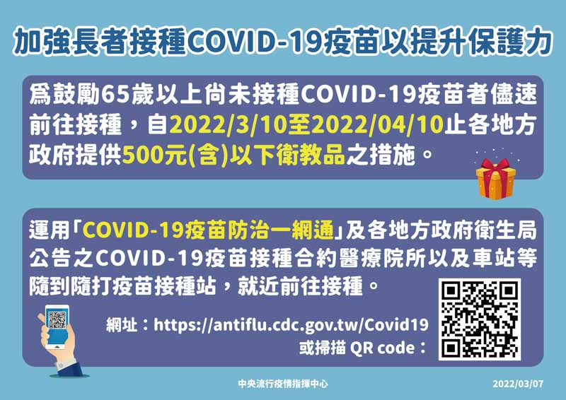 指揮中心在今日的記者會中表示,為了要鼓勵65歲以上長者盡快接種疫苗,決定在3月10日至4月10日期間內,讓原本200元的獎勵贈品提高到500元。