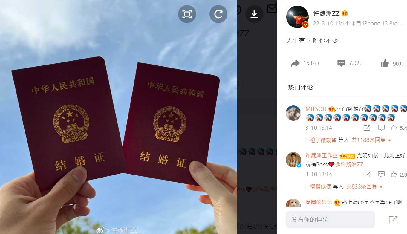 許魏洲今日選了13:14這個時間官宣結婚,取「一生一世」的諧音,PO出了兩本深紅色的結婚證,並附上短短的一句話「人生有幸,唯你不變」。許魏洲長相英挺帥氣,但因演出BL劇,所以囊括各路粉絲;他官宣結婚之後,短短2小時就有85萬網友按讚,部分粉絲因為男神結婚而相當崩潰,但大部份粉絲還是獻上真誠的祝福。
