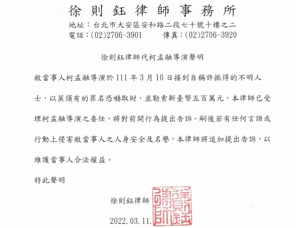 柯孟融的太太宋燕旻則在臉書貼出委託律師提告的文件,並強調自己相信老公的清白,「我相信我先生,他是一個正直善良的人,我們不會向任何惡勢力低頭,也不會接受莫須有的抹黑」。