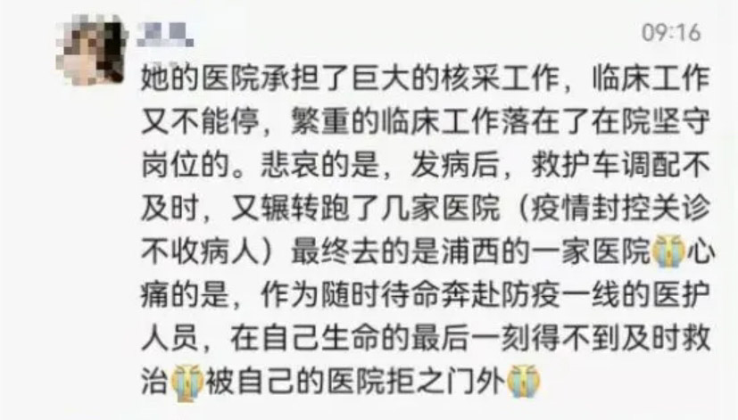 知情人士感嘆,「作為隨時待命奔赴防疫一線的醫護人員,在自己生命的最後一刻得不到及時救治,被自己的醫院拒之門外」。