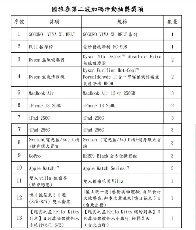 「國旅券用起來 大獎跟著來」獎獎項包括首獎Gogoro VIVA XL BELT、「鳴日號」花東三日遊等,總市值超過60萬元的多項好禮。加碼大獎預計在5月10日與觀光遊樂業的百萬大獎一同抽出,提醒民眾把握最後37天使用國旅券折抵消費,呼朋引伴春遊趣。