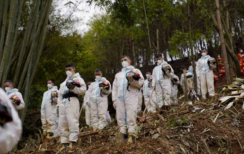 ▲搜救人員在現場脫帽默哀。(圖/鳳凰網)