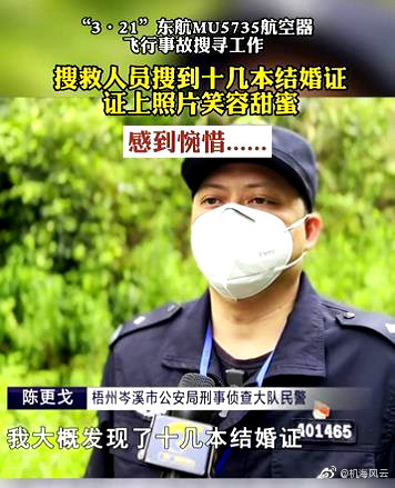 中國東方航空MU5735航班上週一(21)不幸墜機,機上乘客和機組員共132人無人生還,全部罹難,成為中國本土自1994年以來最嚴重的空難。一名在現場搜救多日的員警難過表示,這些天在殘骸、遺物中找到了10多本結婚證,看著證件上每對夫妻甜蜜的笑容,讓他感到相當難過;有網友表示,希望有情人下輩子能夠再相聚。