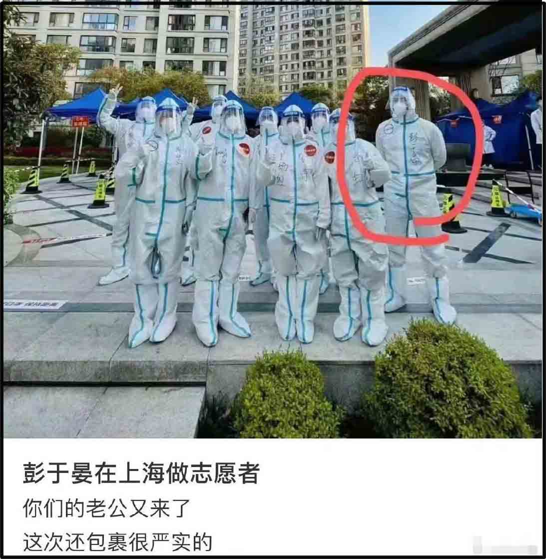 據瞭解,彭于晏現身是為了做篩檢,但隨後卻傳出一張醫護人員和志工全員穿防護衣的合照,照片最右邊、人高馬大的男子,防護衣上寫著「彭于晏」三個大字!有網友稱他是加入了志工行列,親自投入防疫工作,「彭于晏在上海做志願者,你們的老公又來了,這次還包裹很嚴實的」。