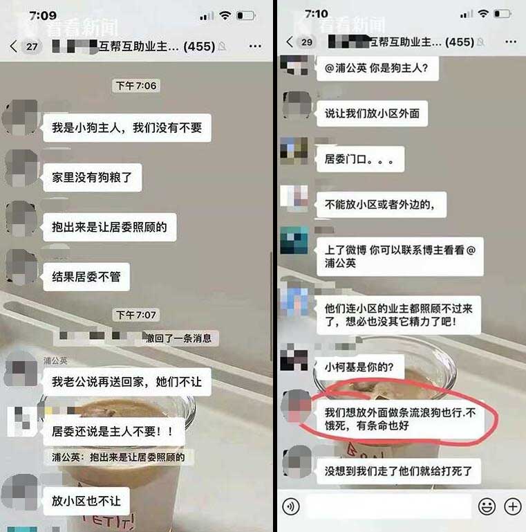 該社區有微信群組,對話內容隨即被截圖PO網,只見飼主解釋絕對不是不要狗狗,而是家裡沒有狗糧,才會在隔離前急忙帶出來,想請管委會幫忙照顧,沒想到管委會拒絕。女主人說:「我老公說再送回家,他們不讓!」