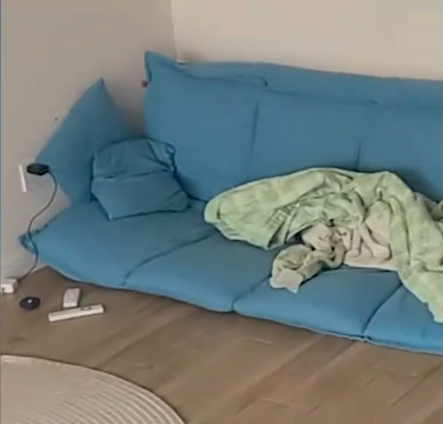 前夫在一旁用手機錄下女子通話過程,鏡頭也順便帶到那看起來超廉價的小沙發,將近1個月的時間都窩在有如懶骨頭一樣的沙發上睡覺,讓許多網友大讚他對前妻真好。他錄下前妻的背影,自配旁白表示兩人已經離婚6年了,現在已經決定,只要一解封、重獲自由,兩人就復婚。