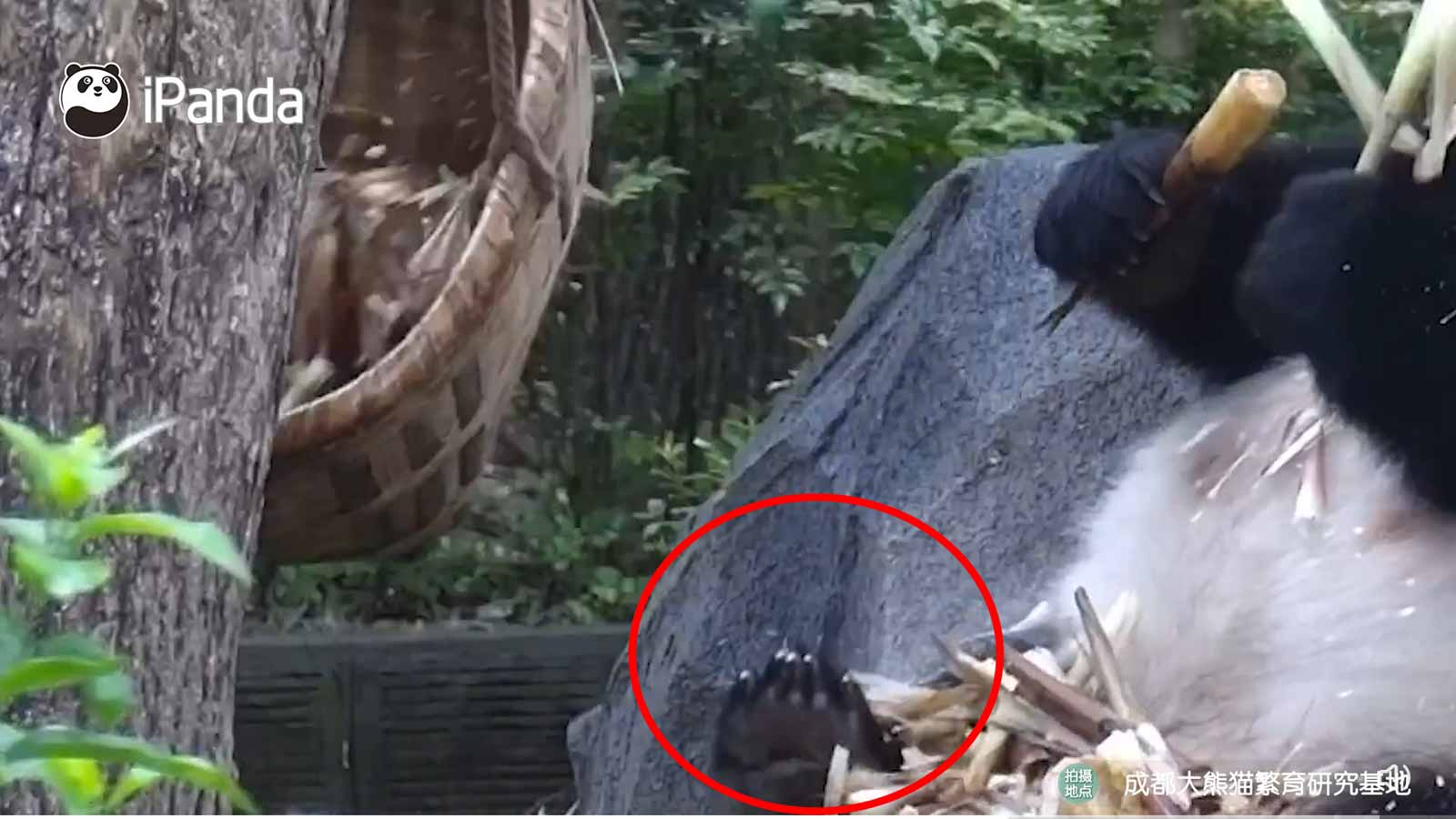 熊貓寶寶這時想要爬出來,兩隻短短小手扶著樹幹,只剩兩隻後腳還在竹籃裡,圓滾滾的身體已經毫無支撐,下一秒果然就摔了出去!但熊貓媽媽完全不理會,甚至還抬起腳來,避免孩子砸到自己!