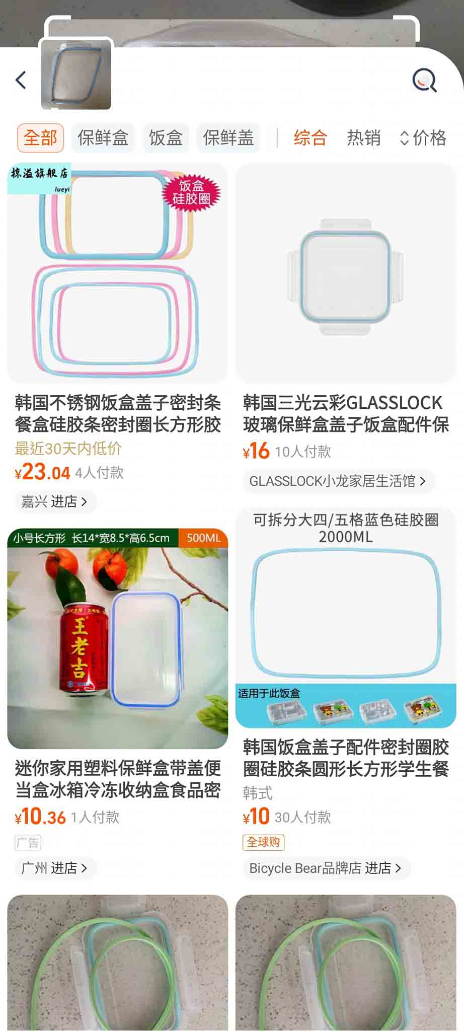 一名網友日前清洗玻璃便當盒時,不慎弄斷了蓋子上的橡膠圈,他隨手拍照後,在中國大陸拍賣平台「淘寶」輸入照片,竟成功找到商品,讓他不由得讚嘆「變態到極致」。有網友搭版用「自拍照」來找商品,結果讓網友看後都笑噴了。
