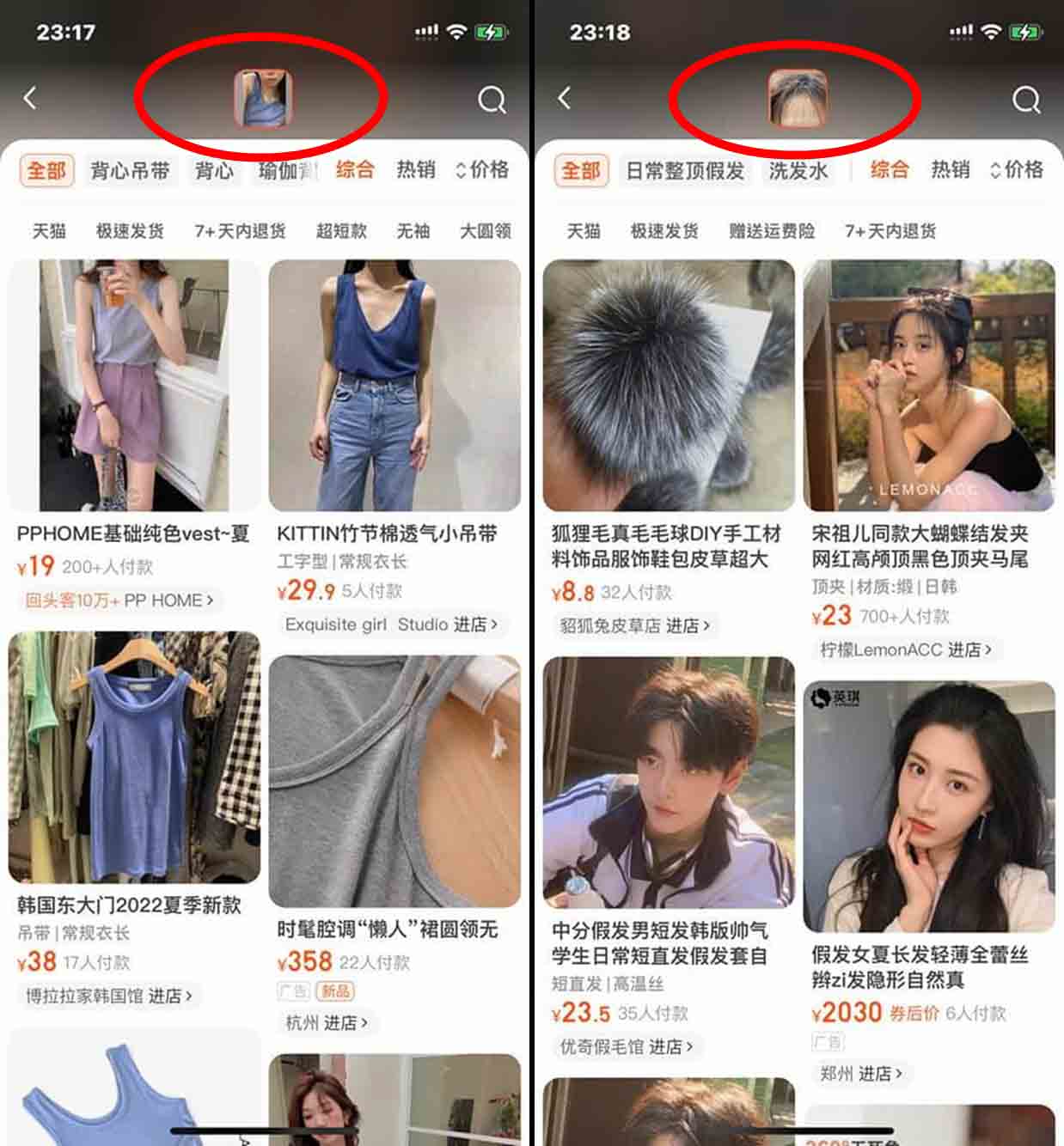 也有網友想要試試看「以圖找商品」的功能,用自拍照來測試,拍了一張自己穿著藍色背心的大頭照,沒想到淘寶竟直接無視網友的臉,幫他找了一大堆同色系的背心!這名網友不死心,決定再拍一張照片試試,「我把整個頭塞滿畫面,他還是忽略我的臉,笑死欸!」第二次測試的結果,淘寶竟推薦他假髮、洗髮精,讓網友看後都笑噴了。