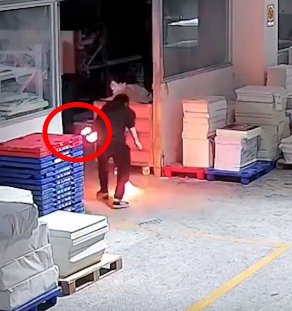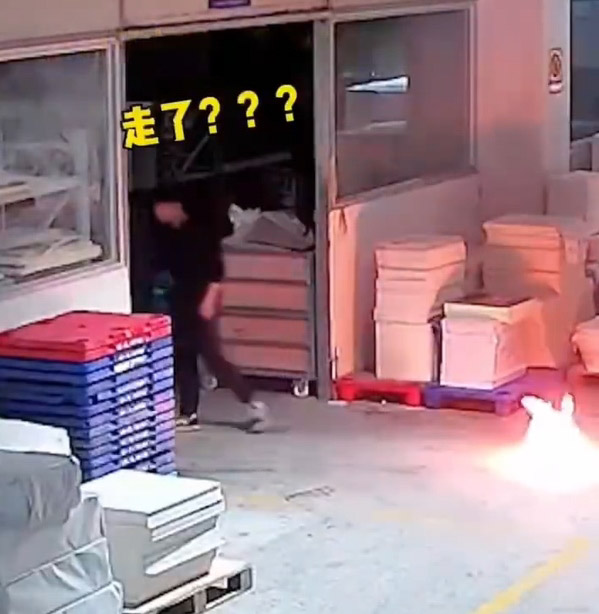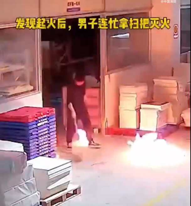 他繼續用掃把拍打著第二攤新生出的火勢,但就連0.1%的效果都沒有;此時他的同事見到起火,立即走來,用腳踩滅了第一攤火勢,接著就返身回到工廠。男子見狀,也跟著同事走開,完全不理他造成的第二攤火。
