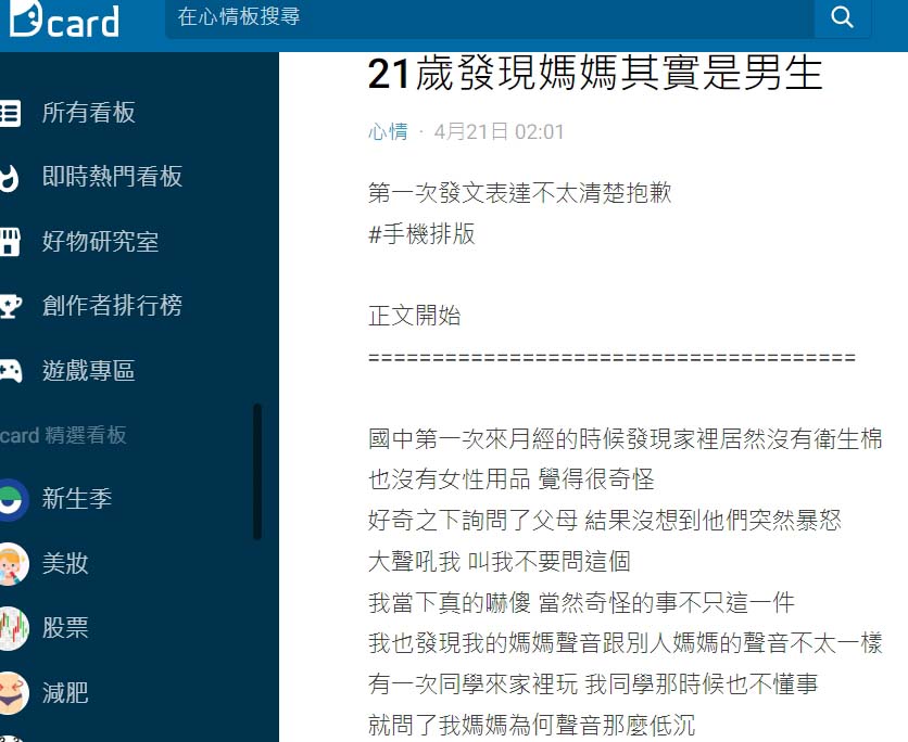 原PO在Dcard心情板發文「21歲發現媽媽其實是男生」,一開始提到國中第一次月經時,家裡沒有衛生棉和女性用品,當時問父母時,他們突然暴怒,大聲吼她,叫她不要問這個。