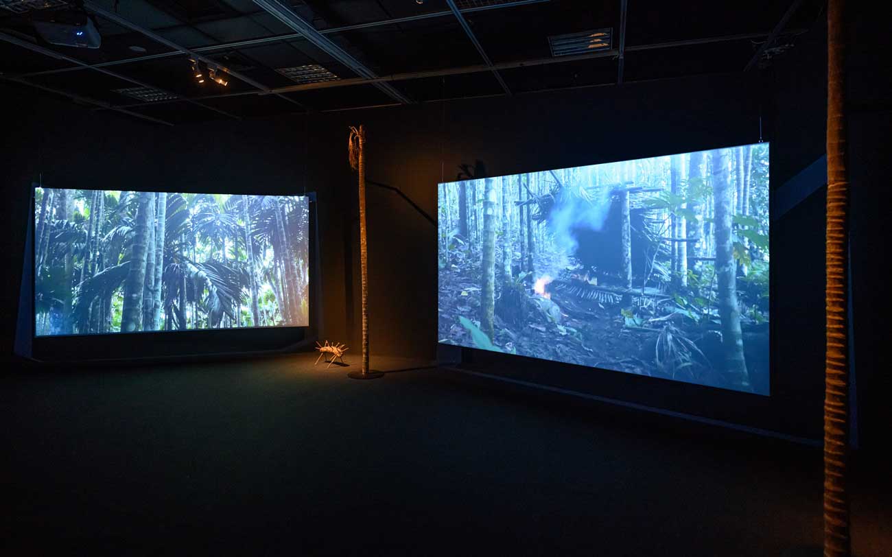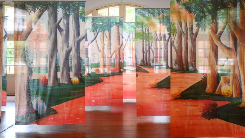 展覽入口可見巨幅布幔,繪製一座山林草木豐盛的景象,似踏入林班工人勞動血汗的叢林、殖民經濟的砍伐場或冷戰下沒入叢林的隱居地,這場展覽就從這座藏納歷史回聲的山林入口揭開序幕。第一軌《我們可不是來玩的》,是移工第一人稱自敘的系列創作;第二軌《再等我三年》,是台泰勞動歌謠與社會政治共振下的聲軌。