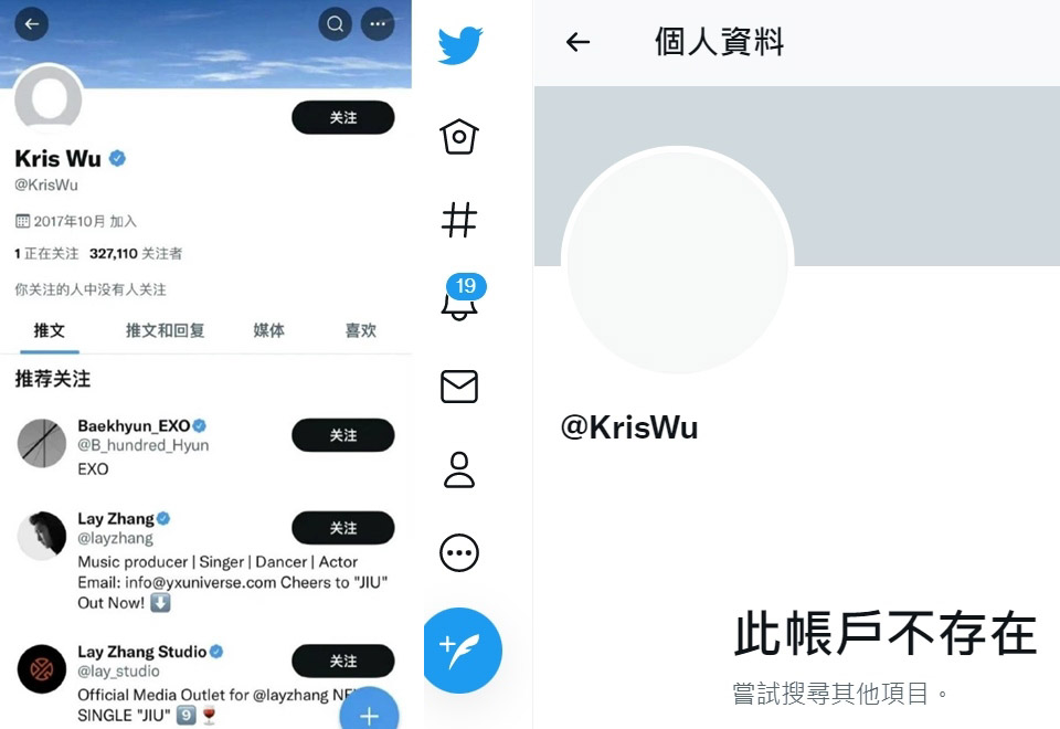 ▲吳亦凡推特才更新藍天白雲照(左),但隨即關閉帳號。(圖/百度)