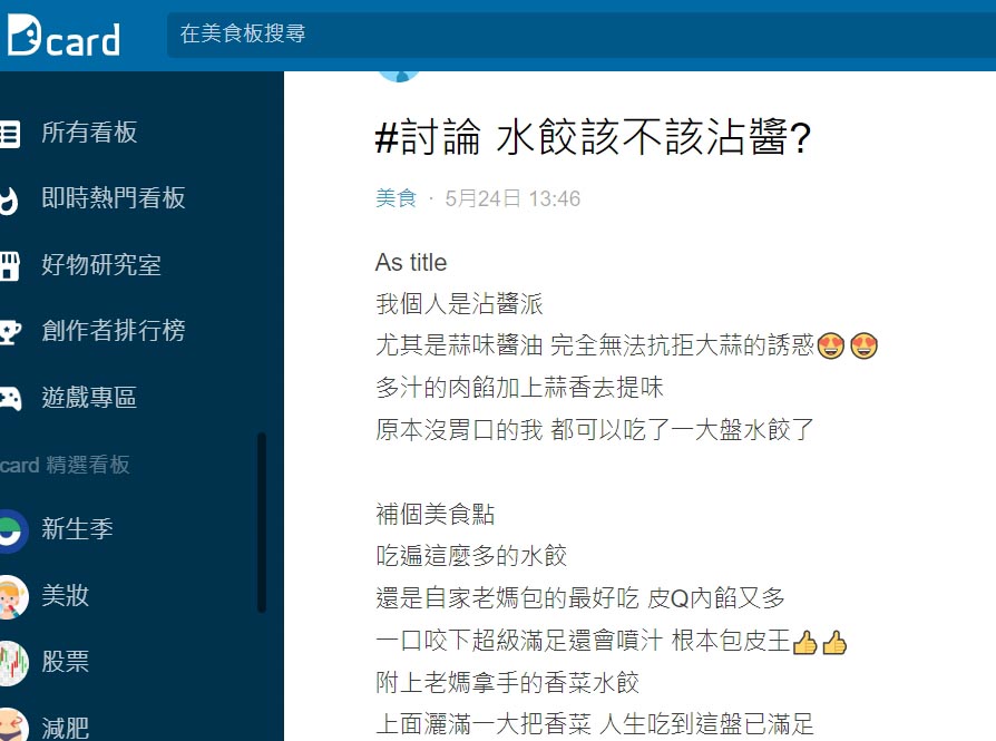 一名網友在Dcard美食板發文討論「水餃該不該沾醬」,並表示自己是沾醬派,「尤其是蒜味醬油,完全無法抗拒大蒜的誘惑,多汁的肉餡加上蒜香去提味,原本沒胃口的我,都可以吃了一大盤水餃了!」